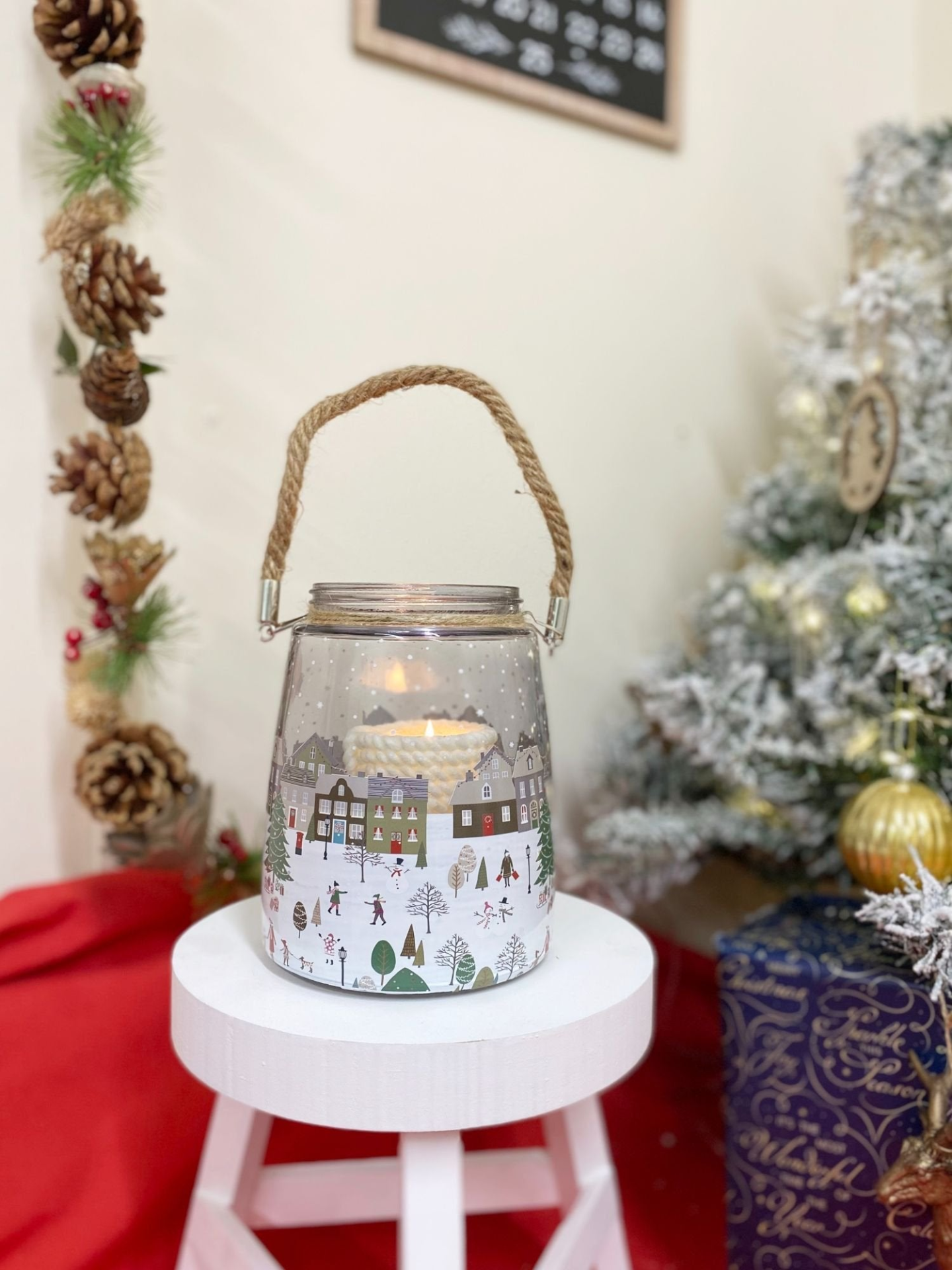This attractive glass lantern is beautifully adorned with a colourful Christmas market scene. The effect is stunning, bringing good cheer and happiness to all during the festive period. The lantern is 16cm x 12.1cm with the rope handle of 14cm. Overall measurements are: D12.1 x H30 x W12.1cm