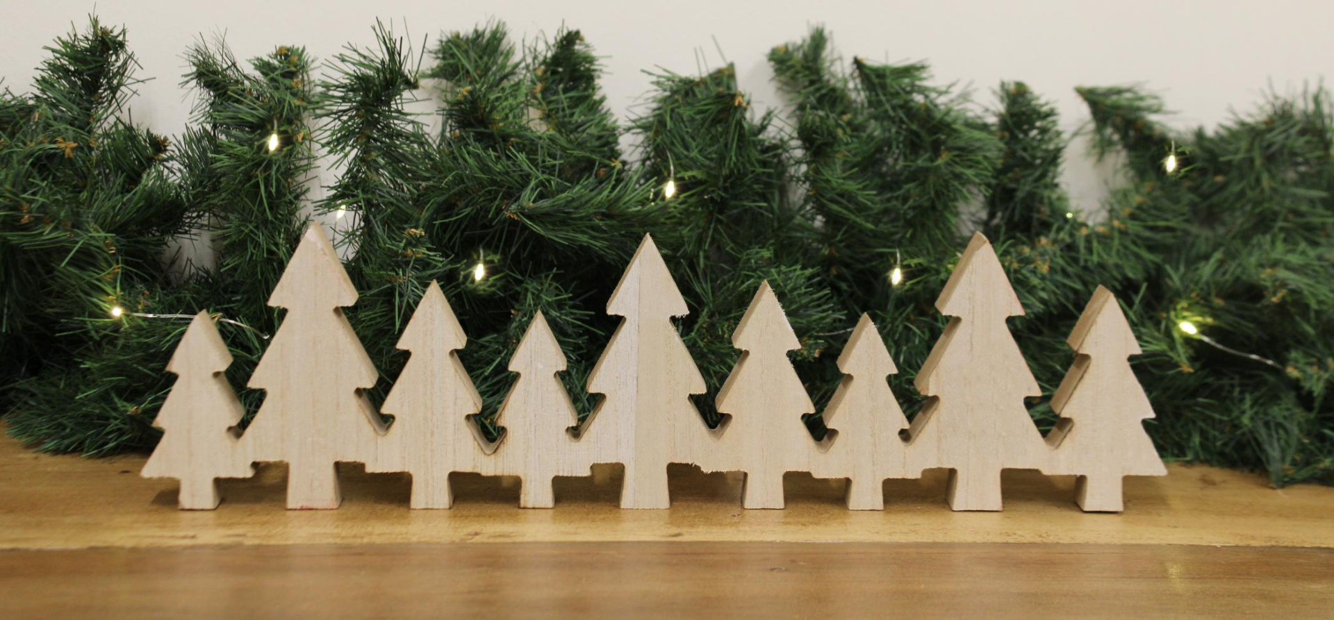 A row of adjoining wooden cut-out Christmas trees with white wooden letters, a festive decoration that can be used to add a touch of festive cheer to any room. Some of the trees are painted Red, Green and White, decorated with a spotty finish and the remaining trees have a natural wood finish. The cut-out trees are made of MDF and Plywood and are designed to resemble the shape of a Christmas tree. Measurements: D2 x H11 x W40cm