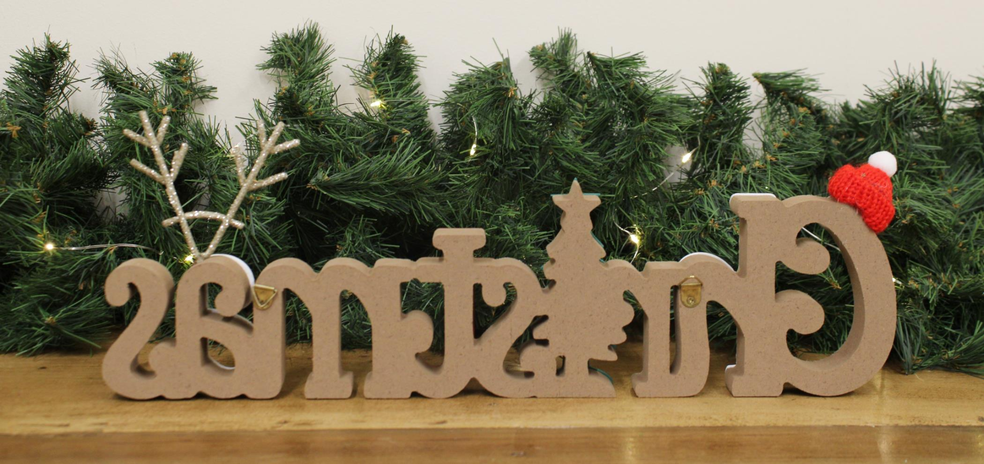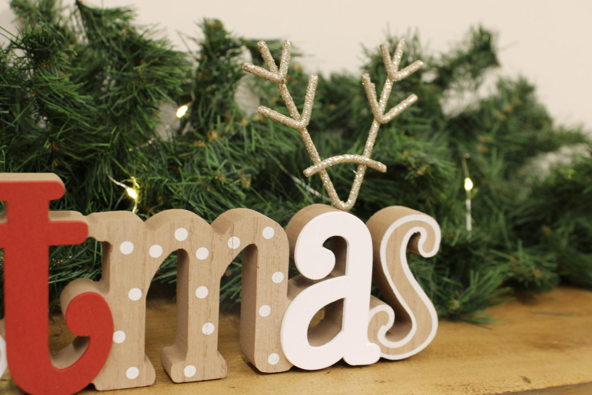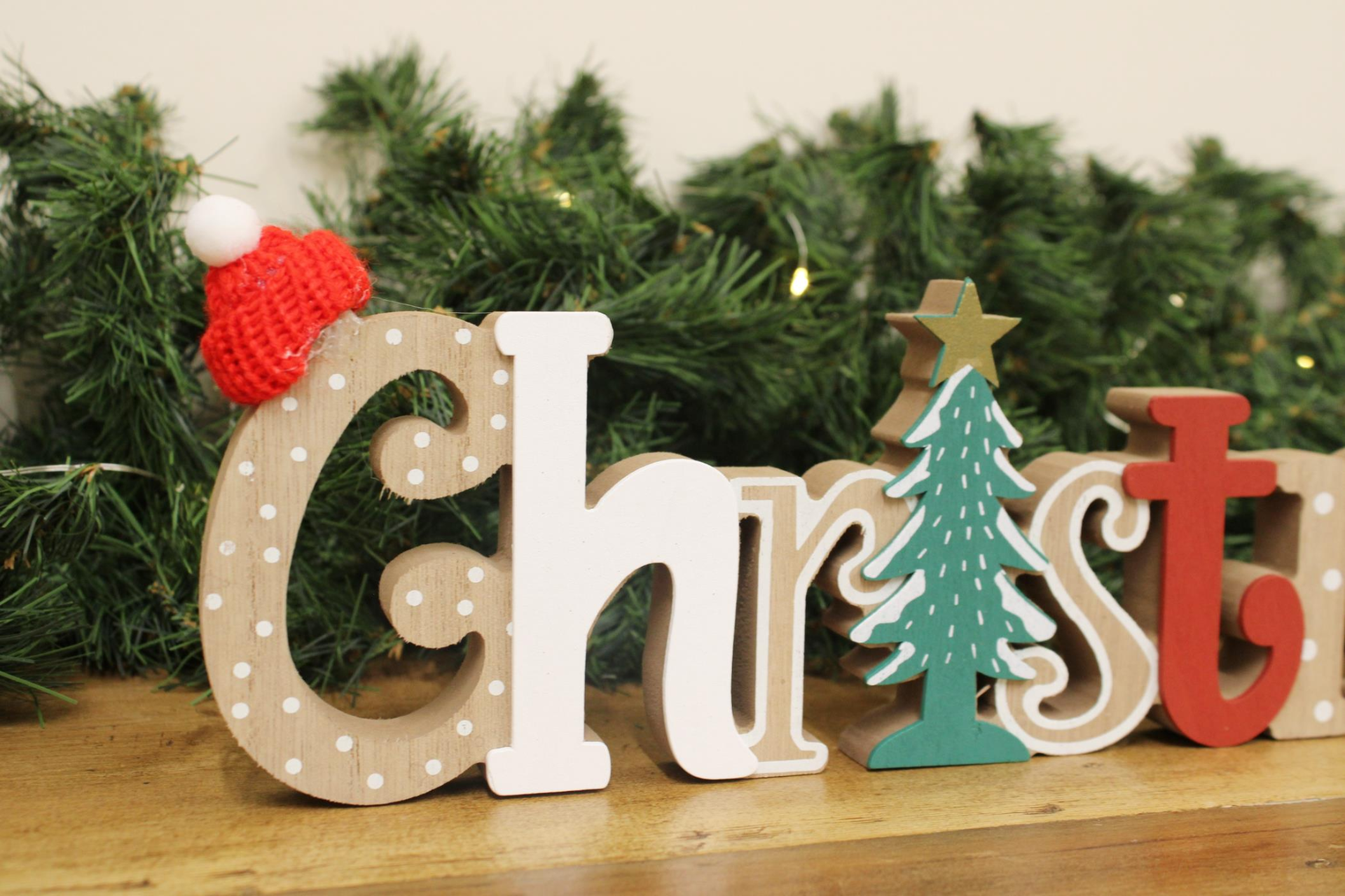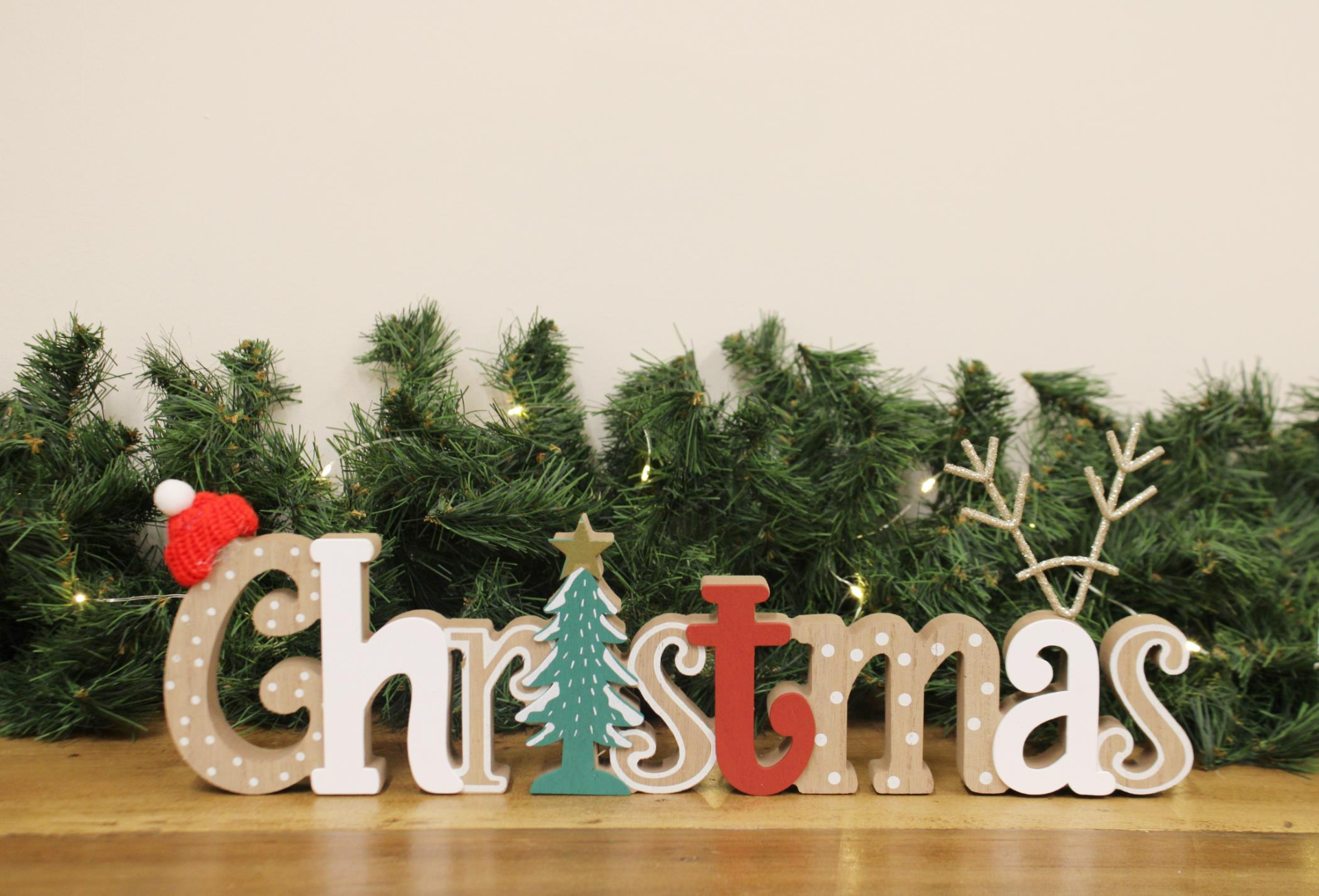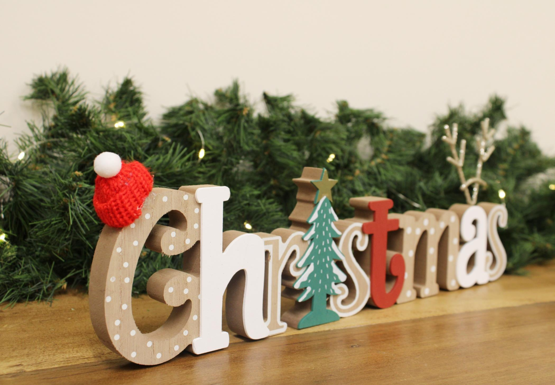 Free-standing carved wooden Christmas word decoration. Decorated in traditional Christmas green, white and red. Measurements: D1.8 x H15.5 x W40cm