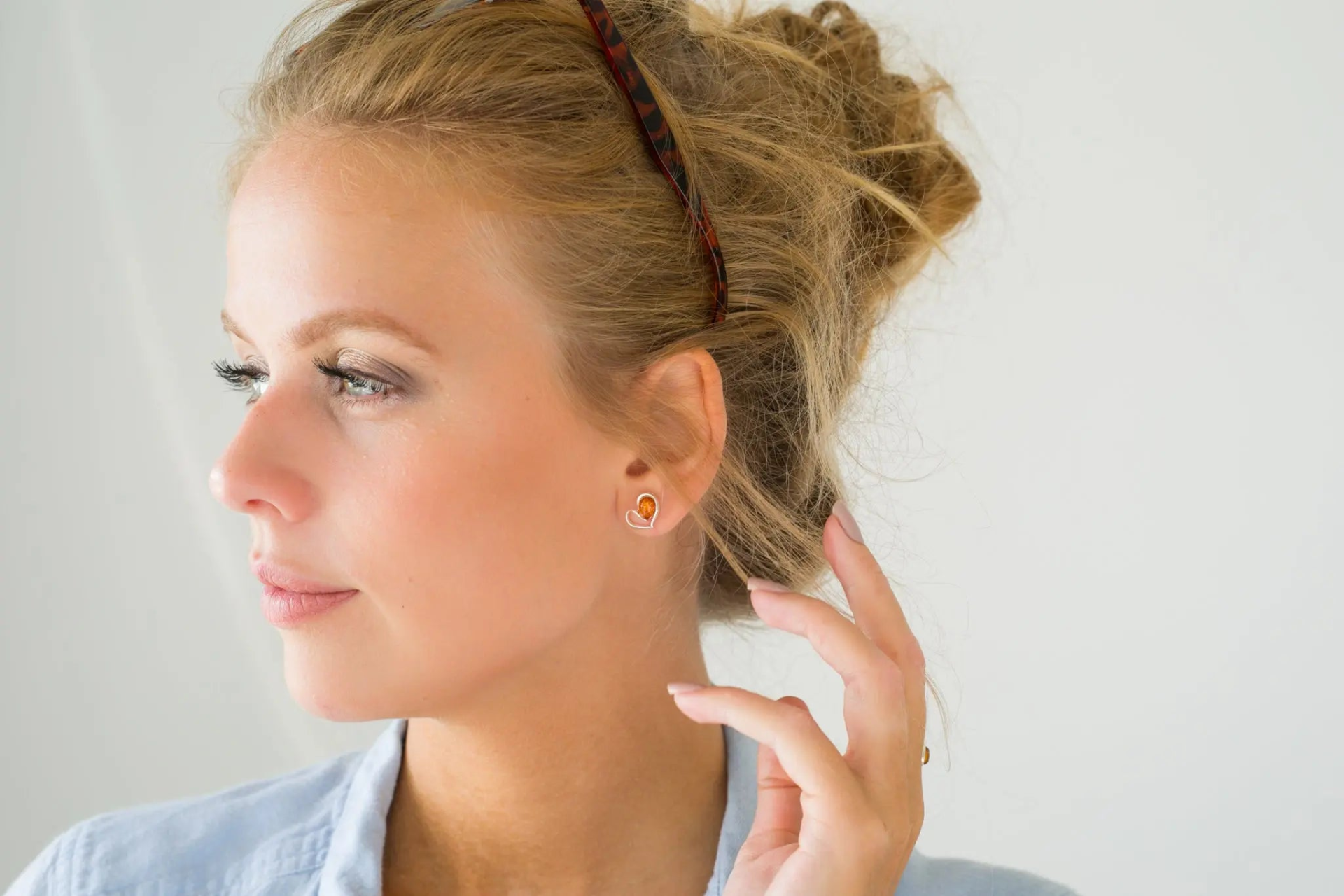 Dainty Stud Earrings featuring a cute and romantic heart frame. Handcrafted with sterling silver with just a gentle touch of baltic amber.