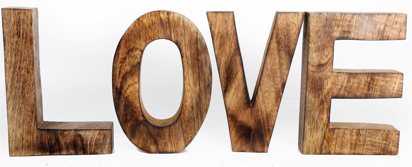 Four dark brown wooden 3D letters that spell the word â??LOVEâ??. The letters are made out of a solid mango wood, making the letters robust and durable. Can be used as a tabletop decoration on any flat surface around the home! These rustic letters blend seamlessly with any modern, farmhouse, country, or vintage design taste. Measurements: W53.5cm x D3.5cm x H20cm. SKU: OR0305A