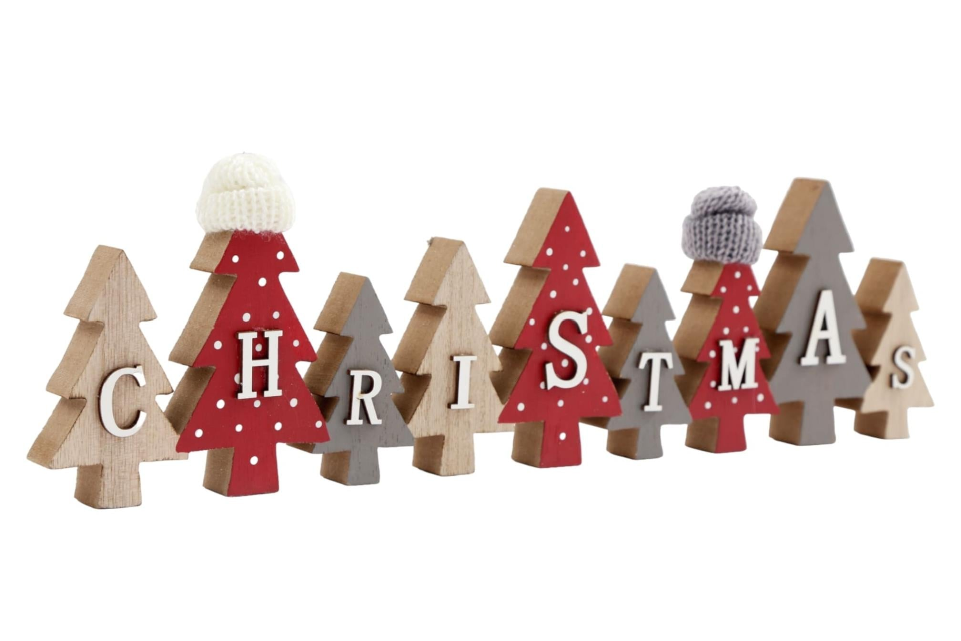 A wooden free-standing Christmas display sign with miniature knitted hats. Some of the trees are painted Red and Grey, decorated with a spotty finish. Measurements: D2 x H11 x W40cm