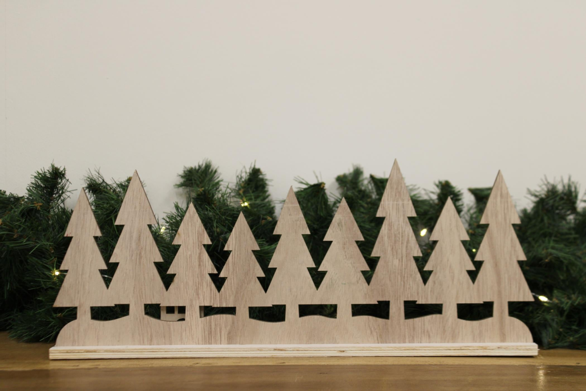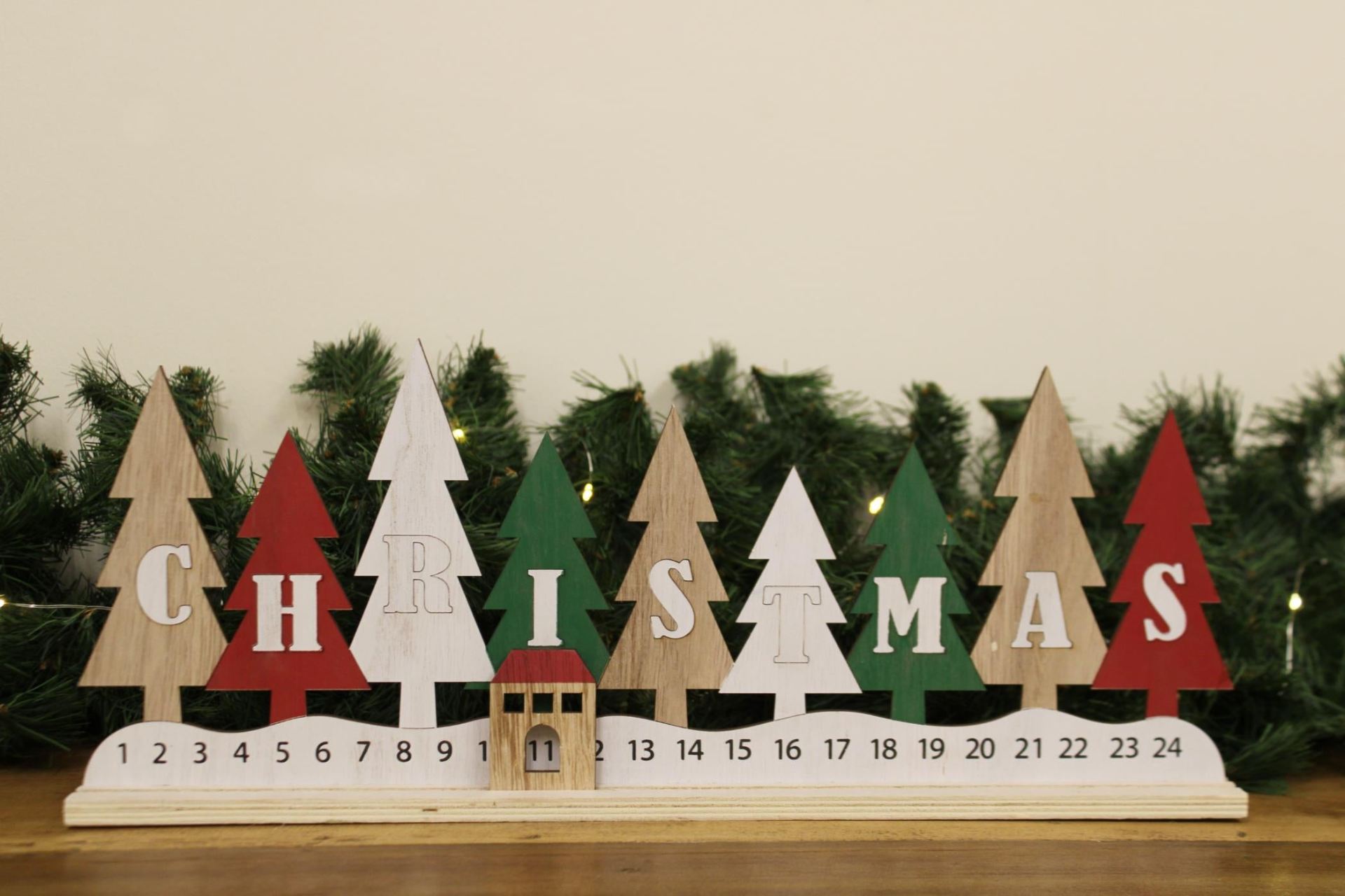 Wooden Christmas trees on plinth, each decorated with a letter spelling out 'Christmas'. Featuring calender count down, with moveable house. Measurements: D2 x H18 x W44cm